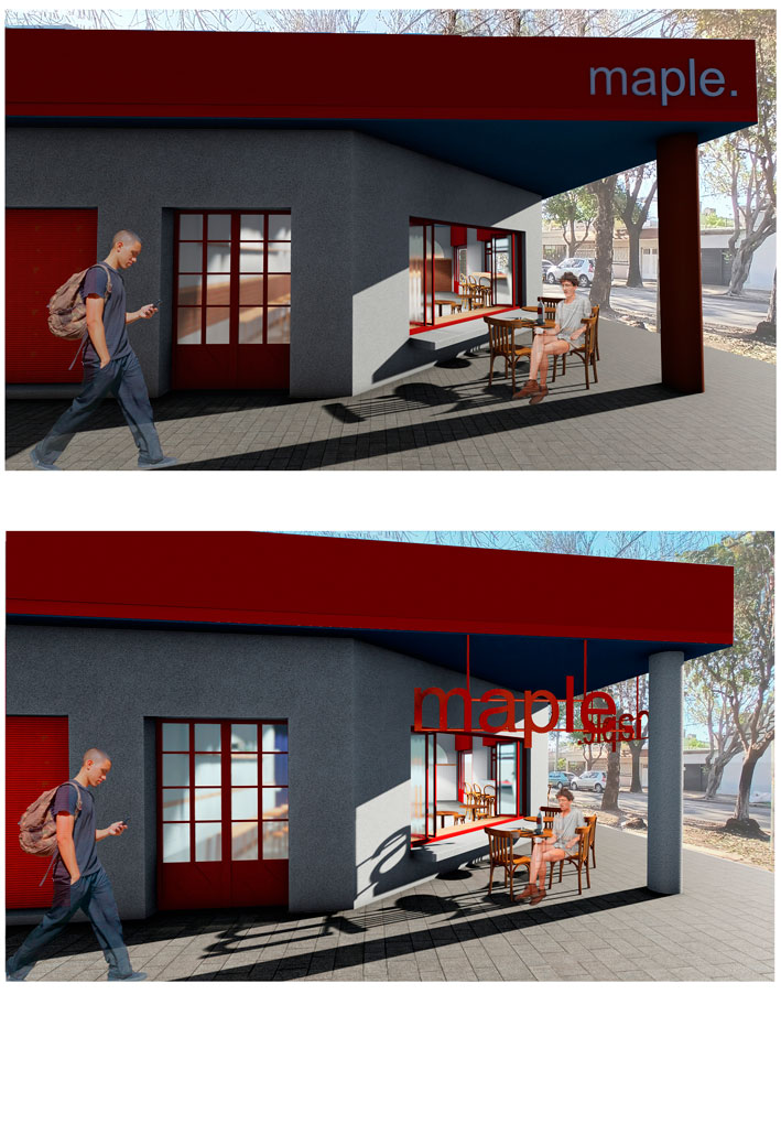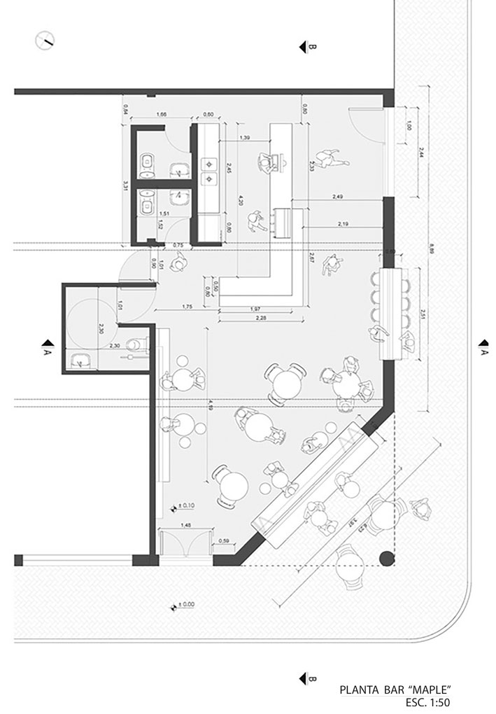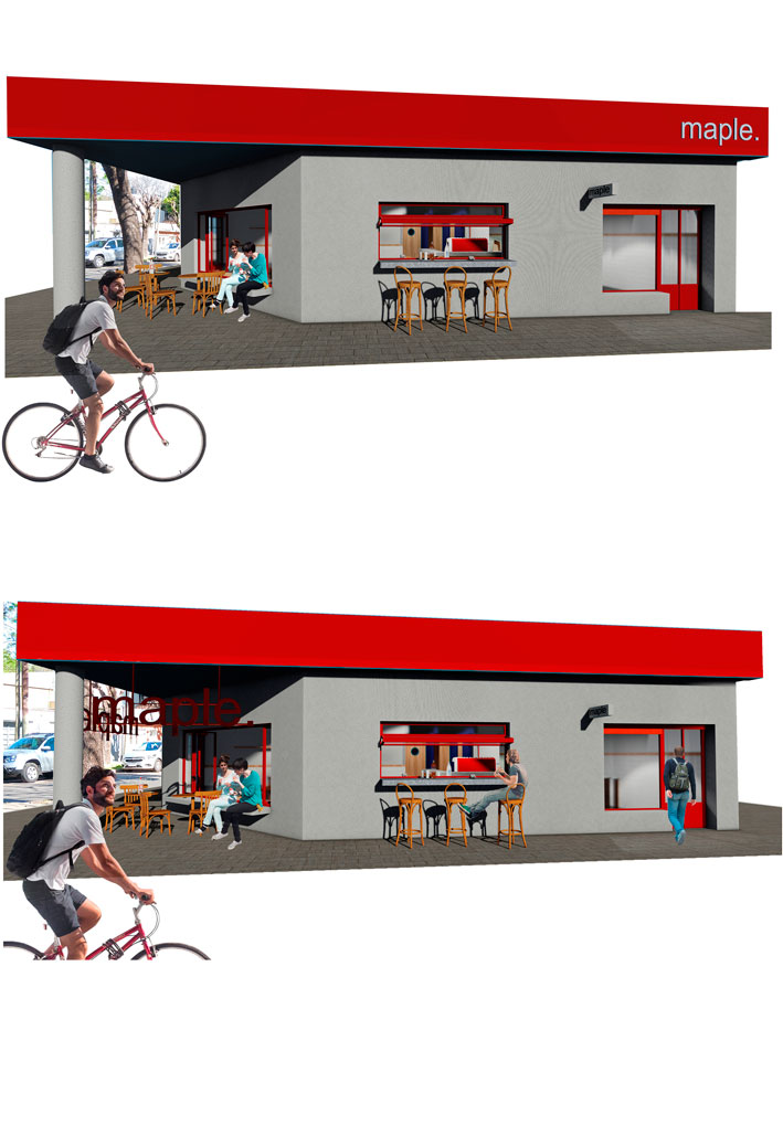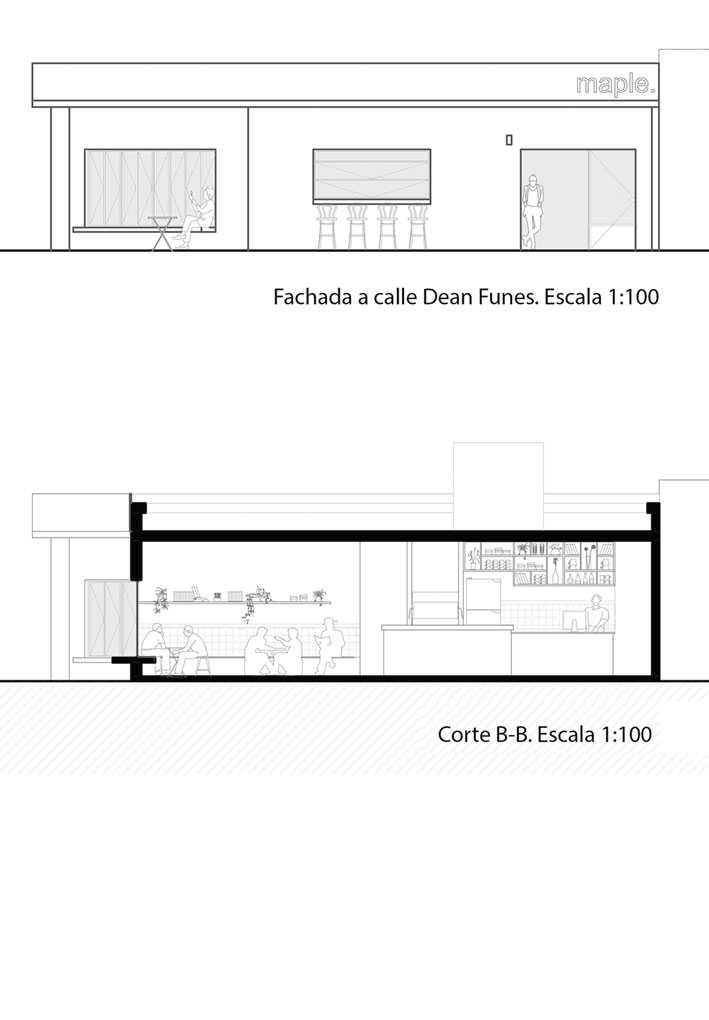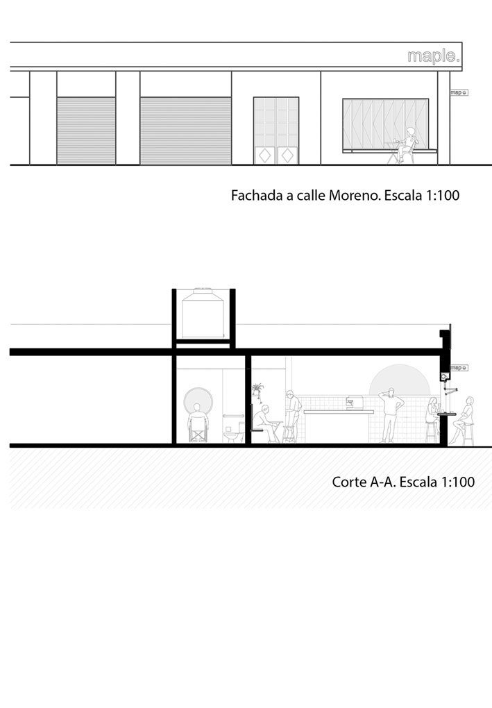 El anteproyecto del bar “Maple” surge como propuesta para un local de la ciudad de Rosario, ubicado en la esquina de Dean Funes y Moreno. La propuesta busca diálogo con las residencias vecinas en cuanto a altura del inmueble y aberturas.