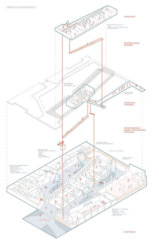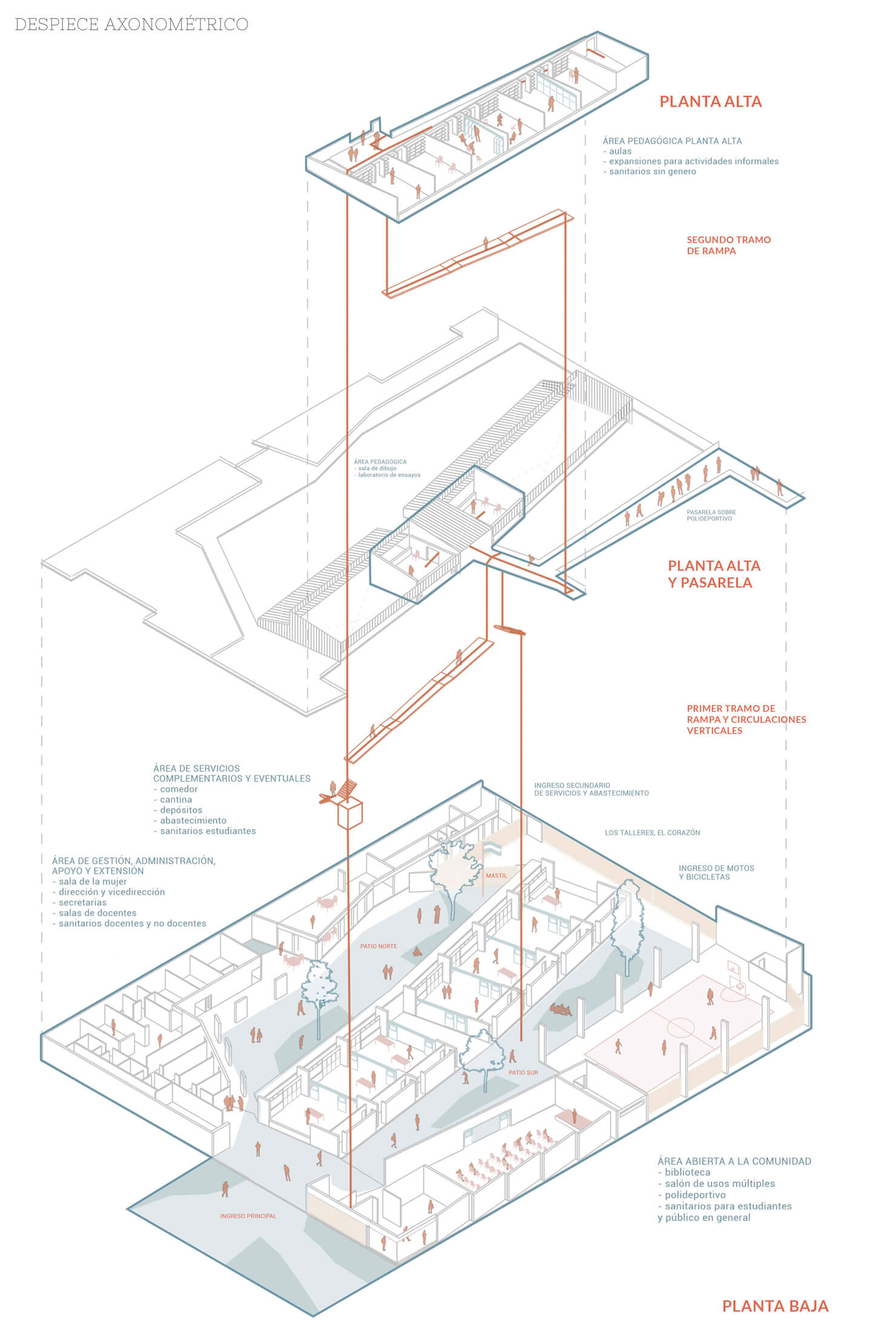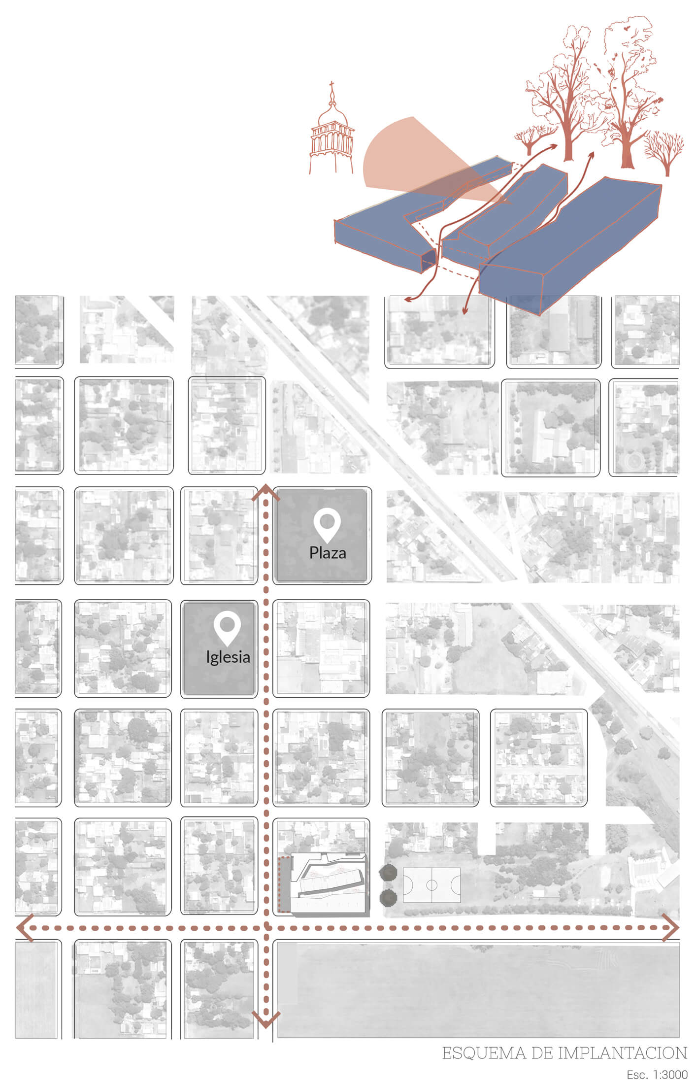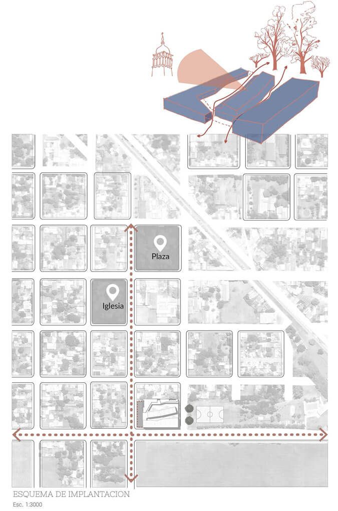 El diseño del edificio para la escuela técnica en Timbués parte de percepciones y del reconocimiento de aspectos particulares identificados al momento de visitar el terreno y sus inmediaciones (edificios singulares y vegetación). A la escuela se la imagina como un lugar de encuentro y uso para toda la comunidad educativa y de la localidad, con propuestas espaciales exteriores e interiores que promueven el encuentro de personas de distintas edades y propician el intercambio y permanencia.